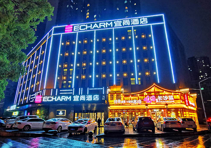 長(zhǎng)沙酒店亮化 戶(hù)外亮化設(shè)計(jì) LED夜景亮化安裝及施工工程采用IP 65防護(hù)等級(jí)的LED線(xiàn)條燈,十字星光燈搭配設(shè)計(jì)。燈具色溫采用冷、暖色搭配設(shè)計(jì),主線(xiàn)條燈勾勒出建筑亮化的輪廓,采用暖色星光燈營(yíng)造長(zhǎng)沙酒店亮化的溫馨氛圍。