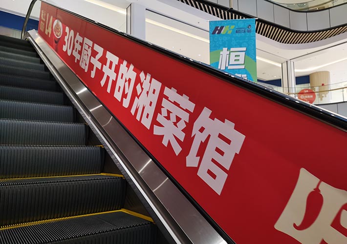 扶梯玻璃與圍擋玻璃的地方通常采用半透明的磨砂寫真貼紙